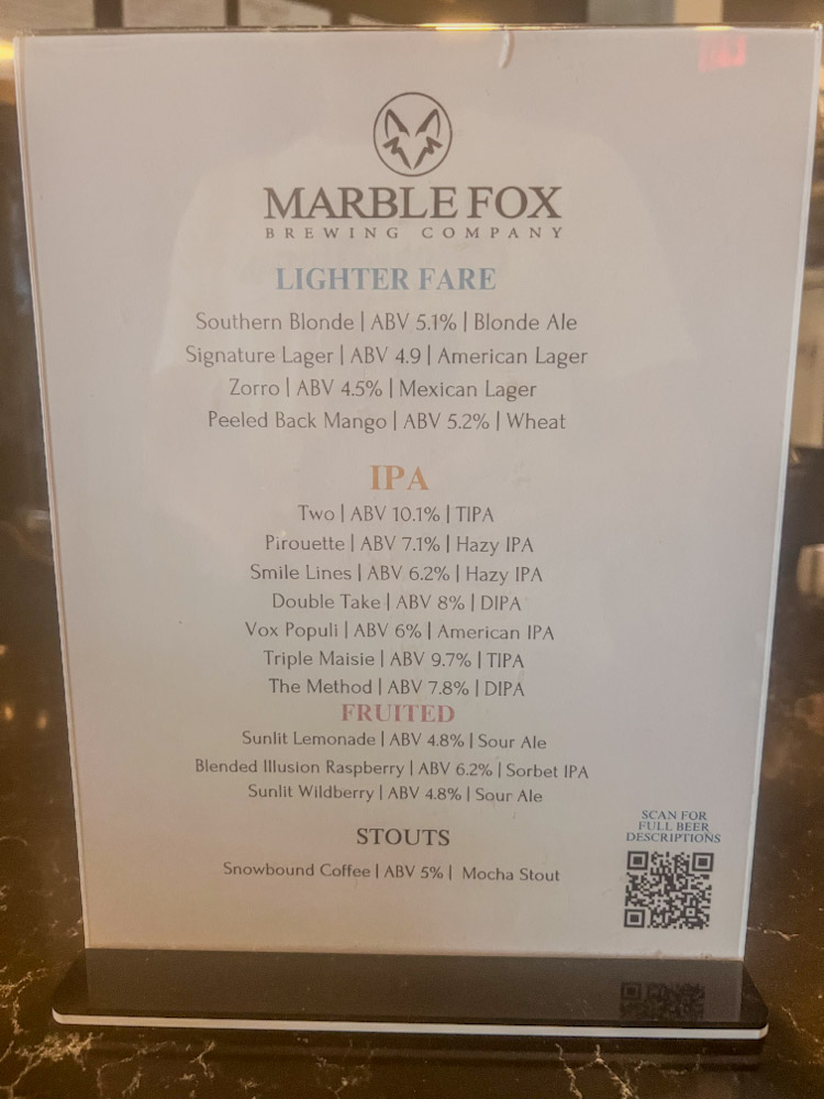 Marble Fox tells us to delight in a unique fusion of peach, honey, and mixed berries that will leave a lasting impression on your palate. It did. This was my favorite beer of the trip!