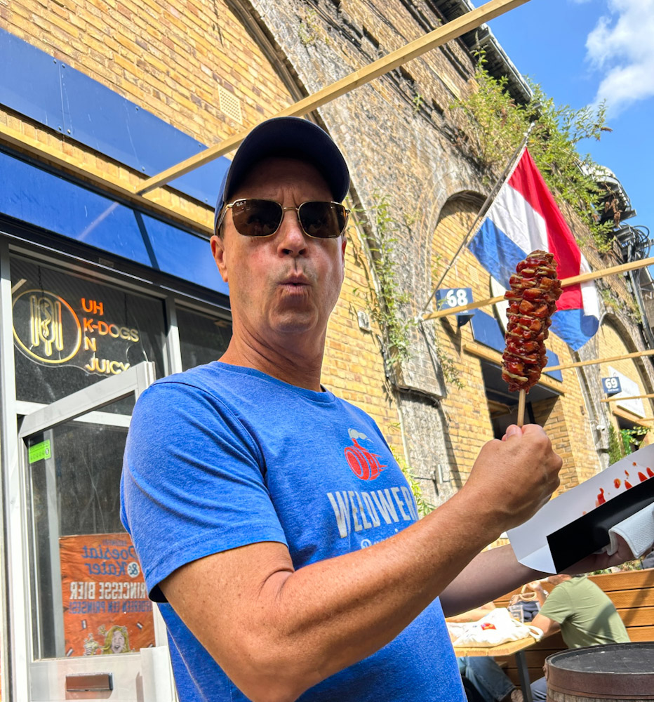 Before diving into the Dutch taps, I decided to fuel up. And oh boy, did I make the right call. A Sweet Potato K Dog — think of a hot dog that fell into a crunchy, golden net of fried sweet potato chunks and came out looking like it belonged on a food magazine cover.